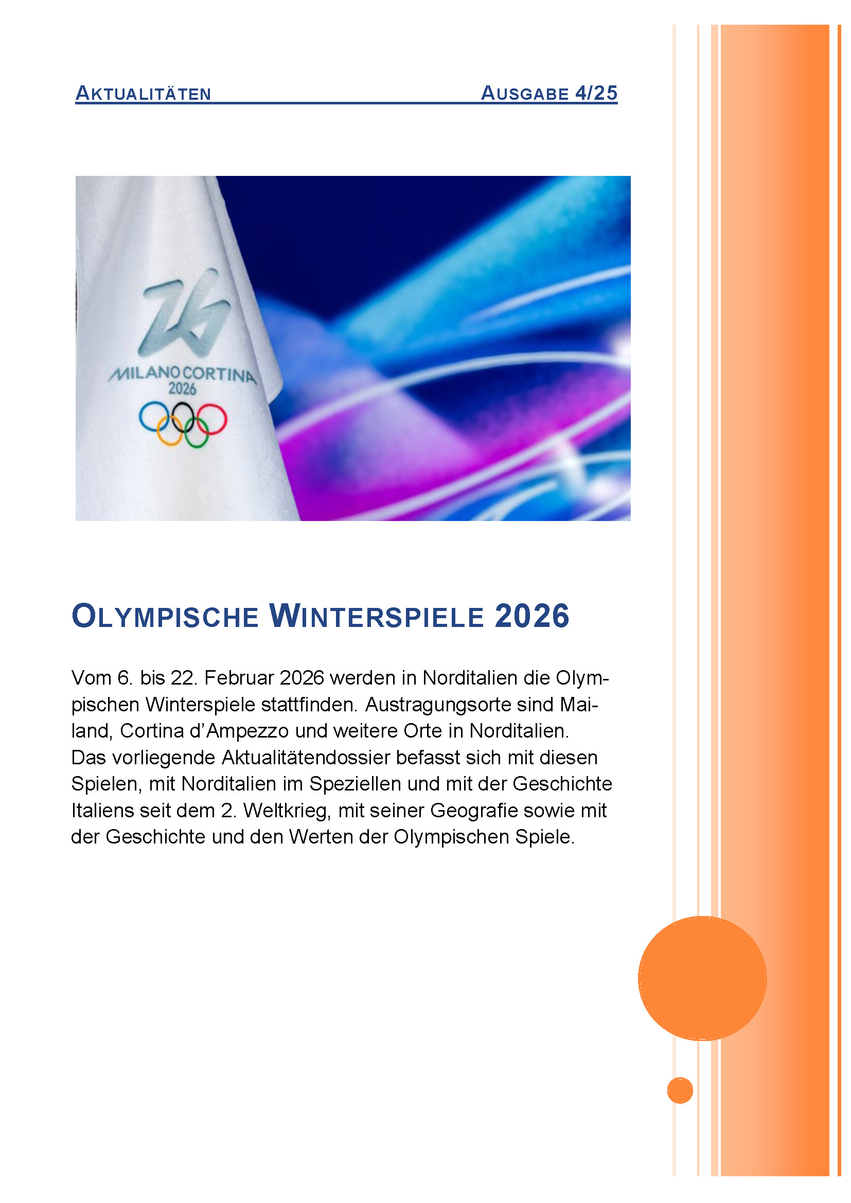 Das vorliegende Aktualitätendossier befasst mit diesen Spielen, mit Norditalien im Speziellen und mit der Geschichte Italiens seit dem 2. Weltkrieg, mit seiner Geografie sowie mit der Geschichte und den Werten der Olympischen Spiele.